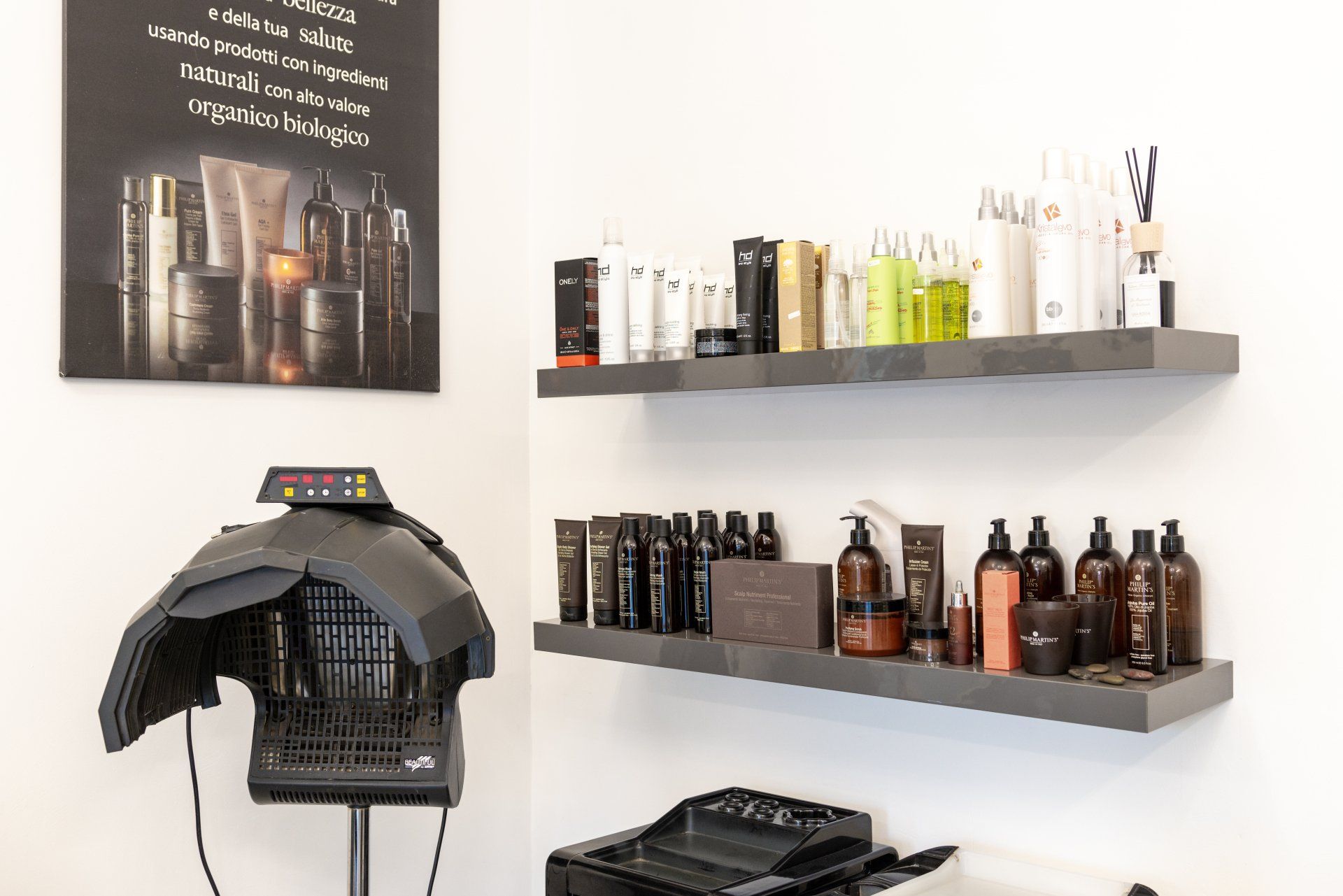 vetrina ricca di creme, lozioni, shampoo e tinture, per trattamenti personalizzati con prodotti biologici. Prodotti che si accordano appieno con le tendenze epocali, ovvero quelle del rispetto dell'ambiente e della natura.